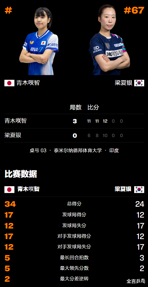 第三局背水一战的梁夏银全程都被压制,开局1-5落后没有轻言放弃,紧接着更是在7-10的位置顽强挽救3个赛点追平,然而10平以后青木咲智再得2分锁定胜利,梁夏银最终以10-12惜败结束整场比赛,由此而在女单首轮被淘汰,无缘晋级32强。