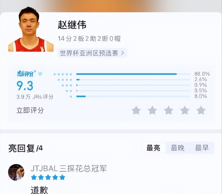 曾经赵继伟在国家队上的表现是很拉胯的,但是本场大战日本的比赛大爆发了,最后时刻被对方恶意犯规也能沉得住气,因为他知道这是日本的主场,再多的抗议也没用,赢球就是最好的反击,今晚的比赛赵继伟做到了。本场比赛赵赵继伟得到了14分2板2助2断,数据很全面。